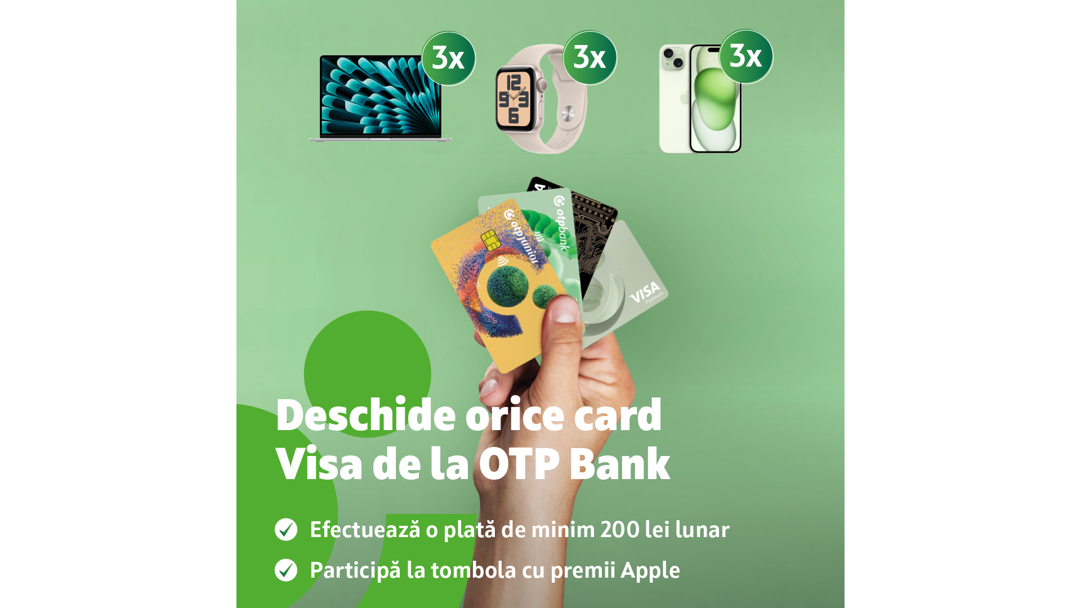 Radu Pascaru: Și asta nu e tot. Vara aceasta, cardurile Visa de la OTP Bank ne bucură cu super premii. Cei care vor deschide cel puțin un card Visa (de orice tip) în perioada 31 mai – 31 august și vor efectua lunar cel puțin o plată de 200 lei (pe un singur bon) în această perioadă, pot câștiga unul dintre cele nouă premii Apple puse la bătaie: trei notebook-uri MacBook Air 15, trei telefoane iPhone 15 și trei ceasuri inteligente Apple Watch SE.