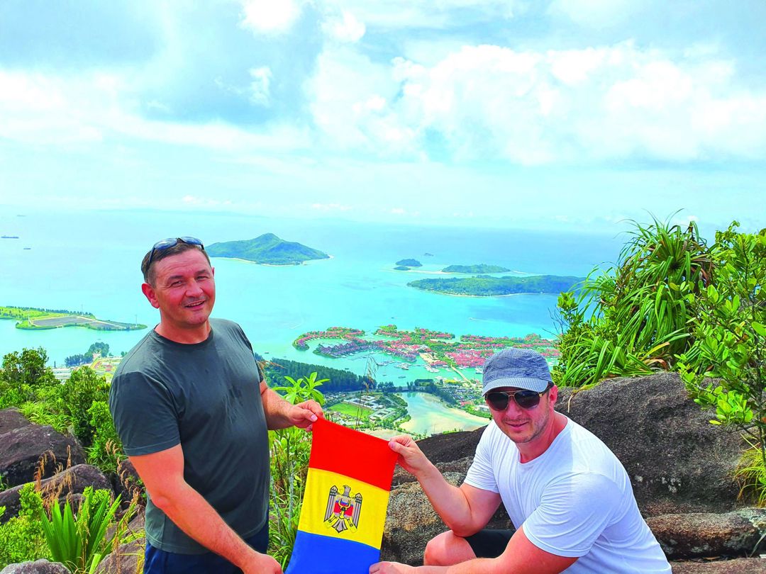 Iulian Crețu (în stânga), fondatorul Gardecor, pe insulele Seychelles, Oceanul Indian