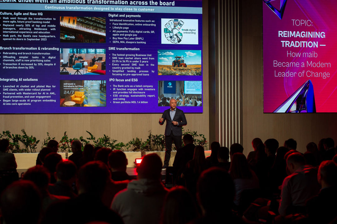 Giorgi Shagidze, președinte maib, a dezvăluit în sesiunea „Reimaginarea tradiției: Cum a devenit maib un lider modern al schimbării" cum a orchestrat cea mai amplă transformare bancară din regiune. Pentru liderii din sală, povestea maib nu a fost doar inspirațională – a fost un manual de implementare despre cum viziunea, cultura și designul organizațional pot redefini o instituție tradițională. Participanții au aflat despre provocările concrete, eșecurile din parcurs și deciziile care au făcut diferența.