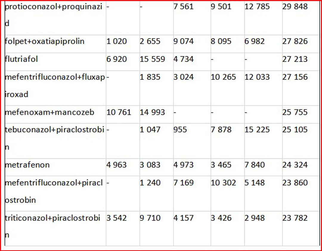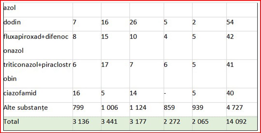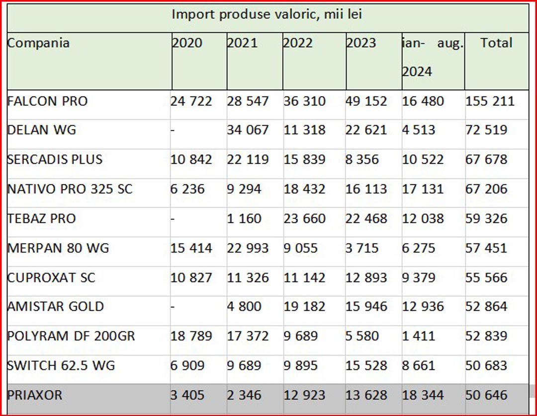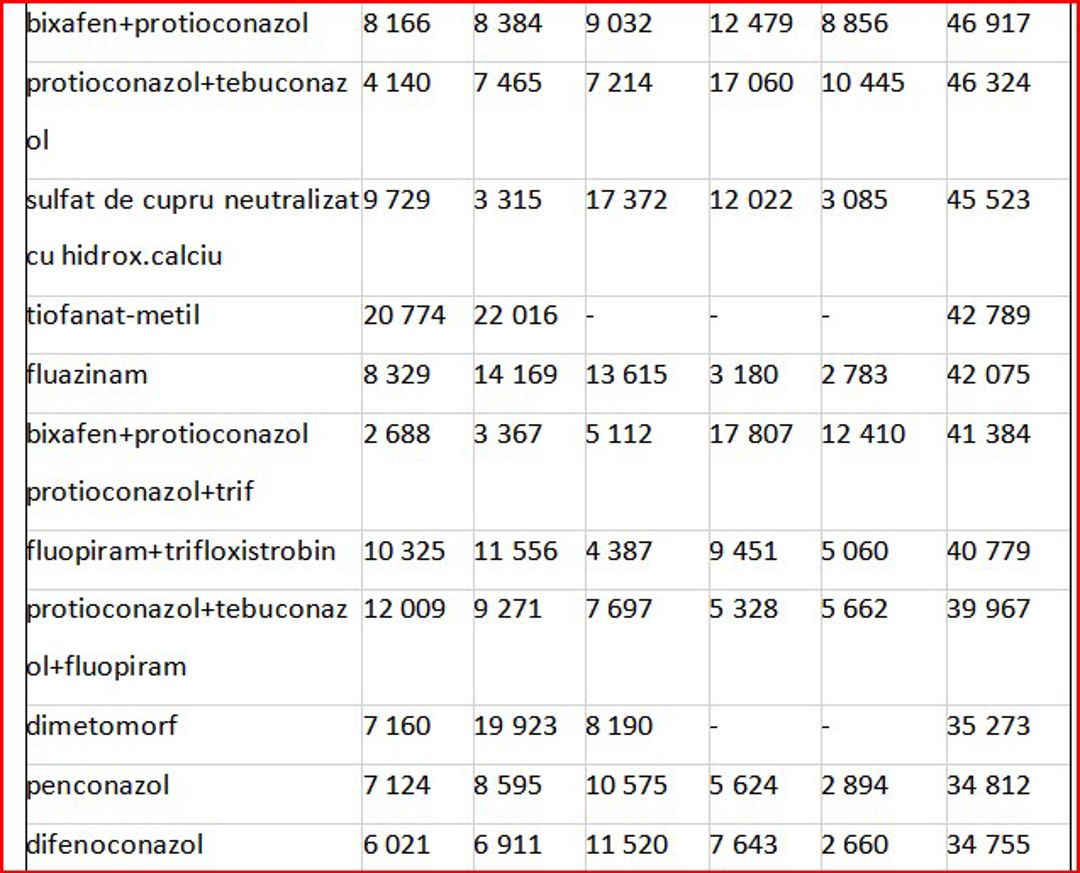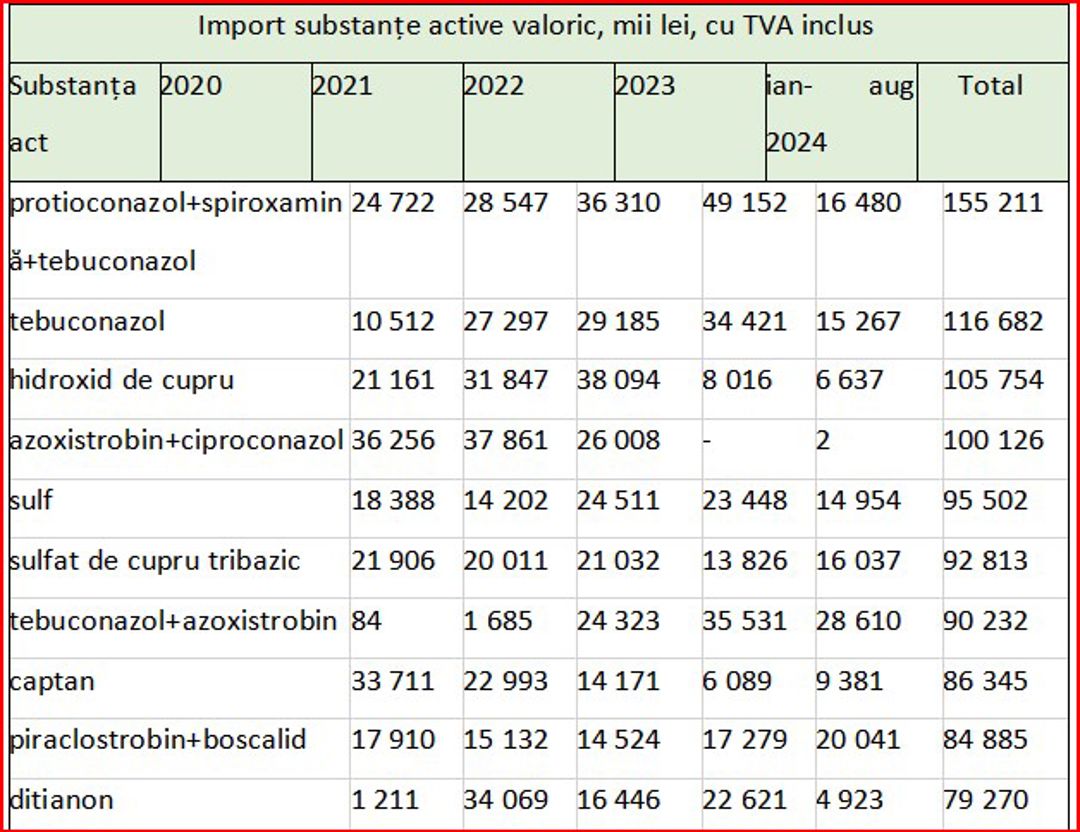 În ceea ce privește valoarea importurilor de fungicide, se remarcă fluctuații de la an la an, în funcție de preferințele pieței. În fruntea importurilor se află combinația de trei substanțe active – protioconazol + spiroxamină + tebuconazol, regăsită în produsul comercial Falcon Pro, fabricat de compania Bayer, utilizat pentru tratarea orzului și grâului. Aceasta a înregistrat cea mai mare valoare importată, cu o evoluție de la 24,7 milioane lei în 2020, la 28,5 milioane lei în 2021 și până la 49,1 milioane lei în 2023. În primele opt luni ale anului 2024, s-au importurile au totalizat de 16,4 milioane lei.