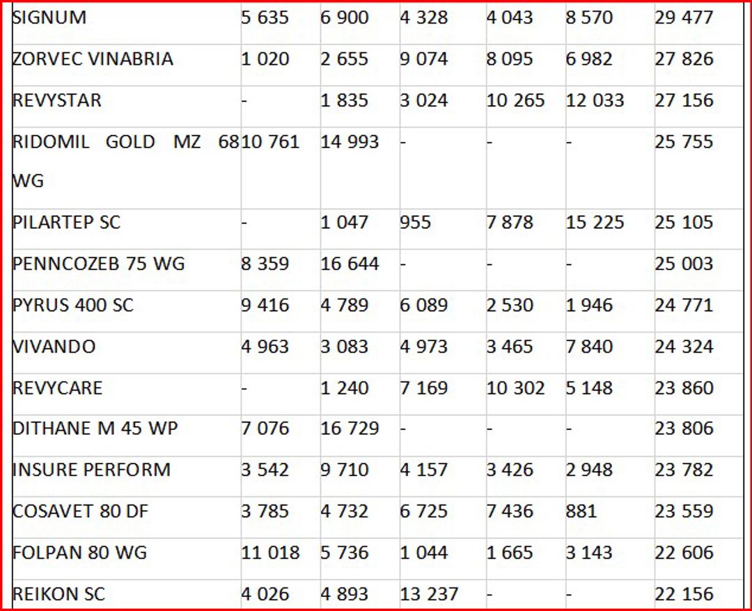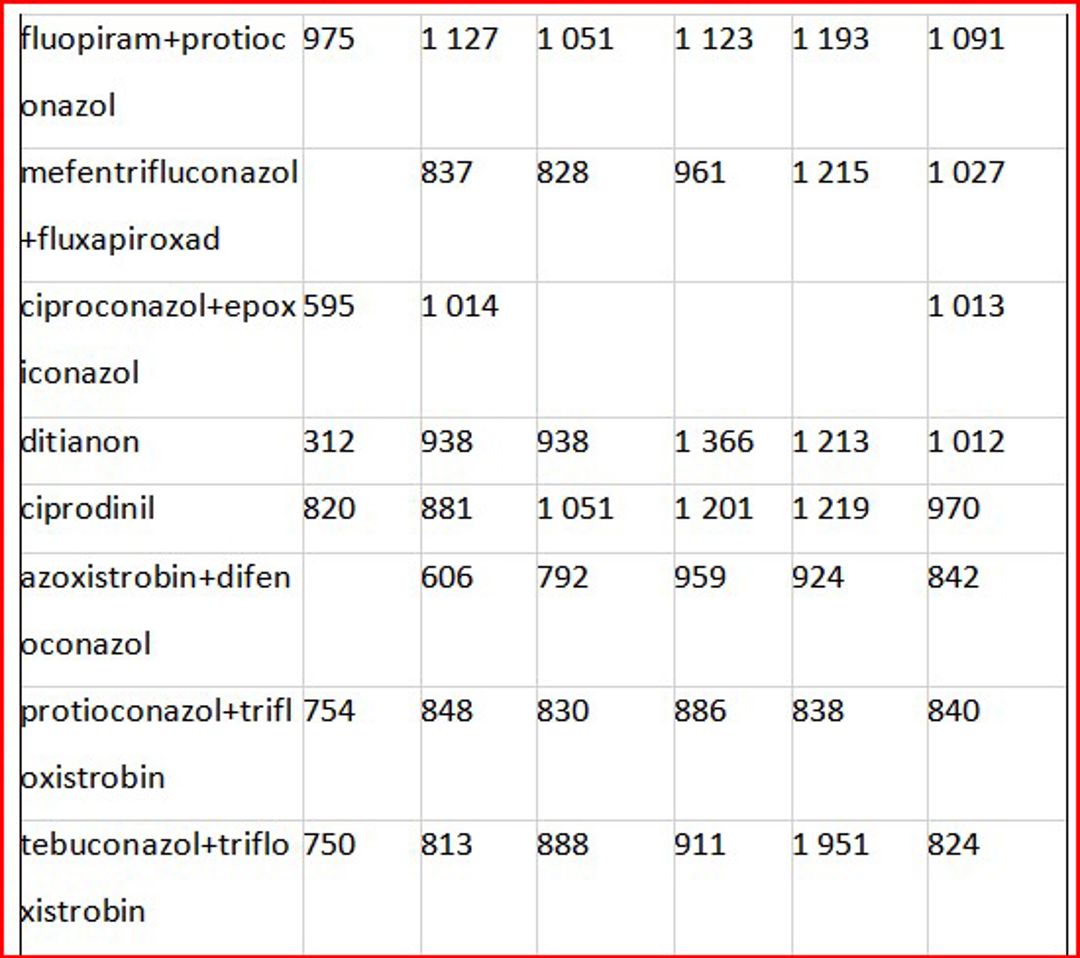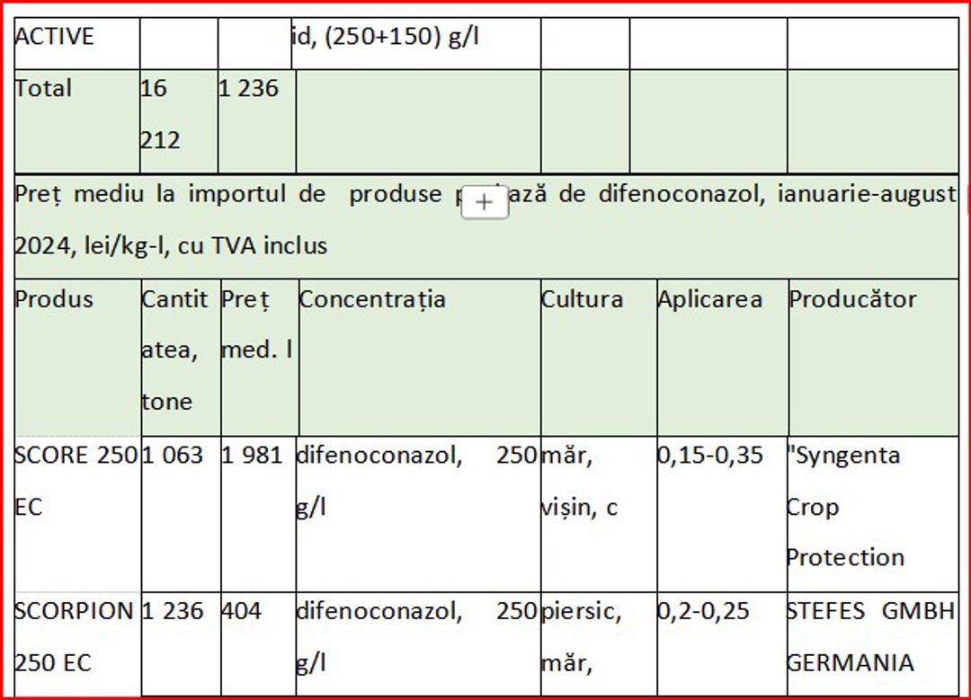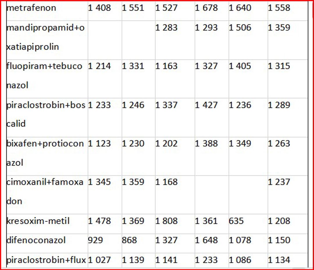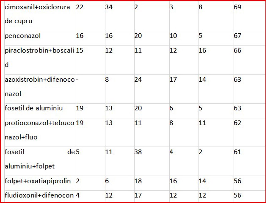 În ceea ce privește valoarea importurilor de fungicide, se remarcă fluctuații de la an la an, în funcție de preferințele pieței. În fruntea importurilor se află combinația de trei substanțe active – protioconazol + spiroxamină + tebuconazol, regăsită în produsul comercial Falcon Pro, fabricat de compania Bayer, utilizat pentru tratarea orzului și grâului. Aceasta a înregistrat cea mai mare valoare importată, cu o evoluție de la 24,7 milioane lei în 2020, la 28,5 milioane lei în 2021 și până la 49,1 milioane lei în 2023. În primele opt luni ale anului 2024, s-au importurile au totalizat de 16,4 milioane lei.