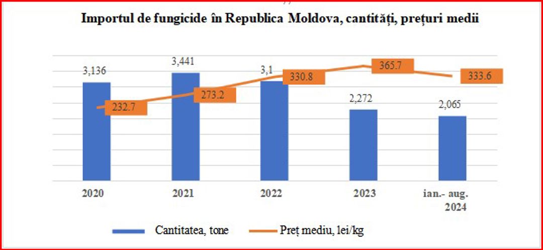 Anual Republica Moldova importă o cantitate de 2 300-3 400 tone de fungicide la un preț mediu de 333,6 lei/kg-l, anul 2024. Prețul mediu de import al fungicidelor a avut o tendință de creștere până în 2023, majorându-se de la 232,7 lei/kg în 2020, la 365,7 lei/kg în 2023. În 2024, valoarea de import a fungicidelor a cunoscut o diminuare până la 333,6 lei/kg, aproximativ nivelul anului 2022.