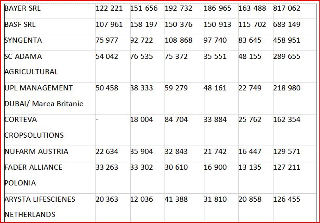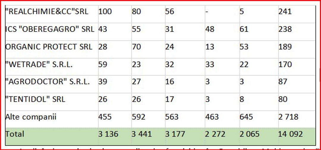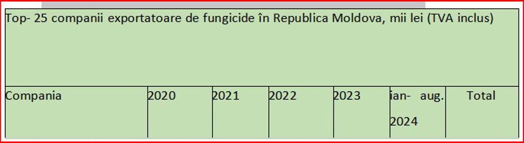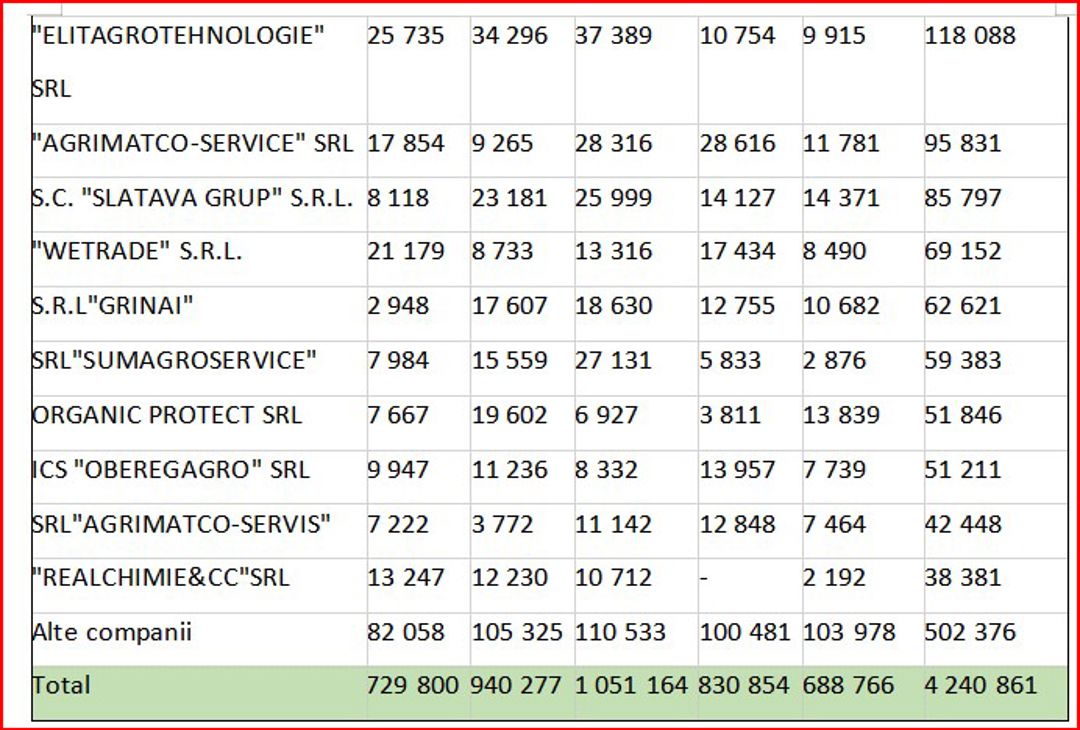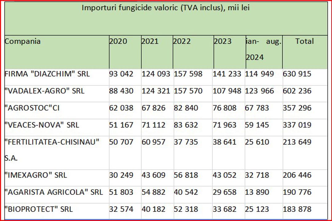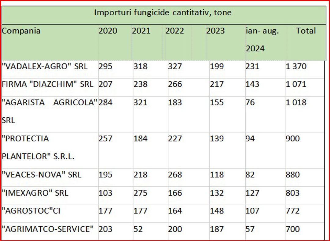 Analizând cantitativ importurile de fungicide în Republica Moldova după companii-importatoare, ies în evidență următorii lideri, în baza cantităților importate pentru perioada ianuarie - august 2024, Vadalex-Agro SRL, 231 tone, Diazchim SRL ,143 tone, Imexagro SRL, circa 127 tone, Agrostoc CI, 107 tone, Protecția Plantelor SRL, 94 tone.