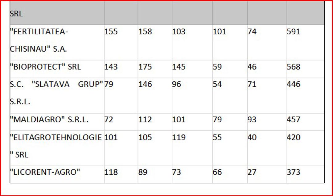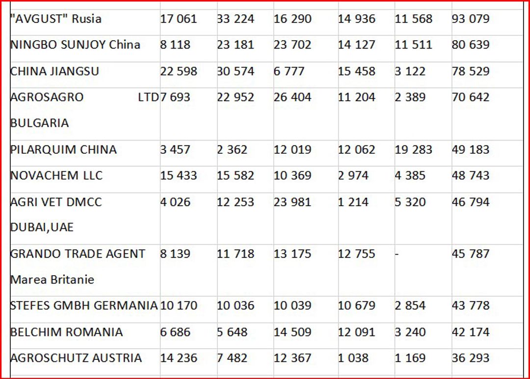 După clasamentul valoric al importurilor, cu TVA inclus, cele mai mari sume pentru perioada ianuarie- august 2024 au fost efectuate de către companiile: Vadalex-Agro SRL, 123,9 mln. lei, Diazchim SRL, 114,9 mln. lei, Agrostoc CI, 67,7 mln. lei, Veaces-Nova SRL, 59,1 mln. lei, Imexagro SRL, 32,7 mln. lei.