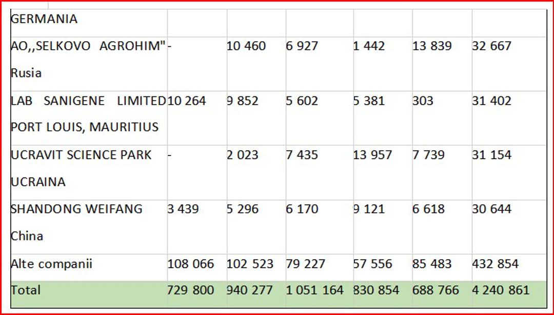 În același timp, apariția unor companii din zone off-shore, cum ar fi LAB Sanigene Limited Port Louis din Mauritius, ridică semne de întrebare cu privire la trasabilitate, importurile de aici fiind originare din China- pe insulele Mauritius nu au loc producerea unor asemenea preparate. Restul firmelor din afara topului contribuie cu un volum total de importuri de 85 milioane lei, ianuarie- august 2024 ceea ce indică un nivel solid de diversificare a surselor.