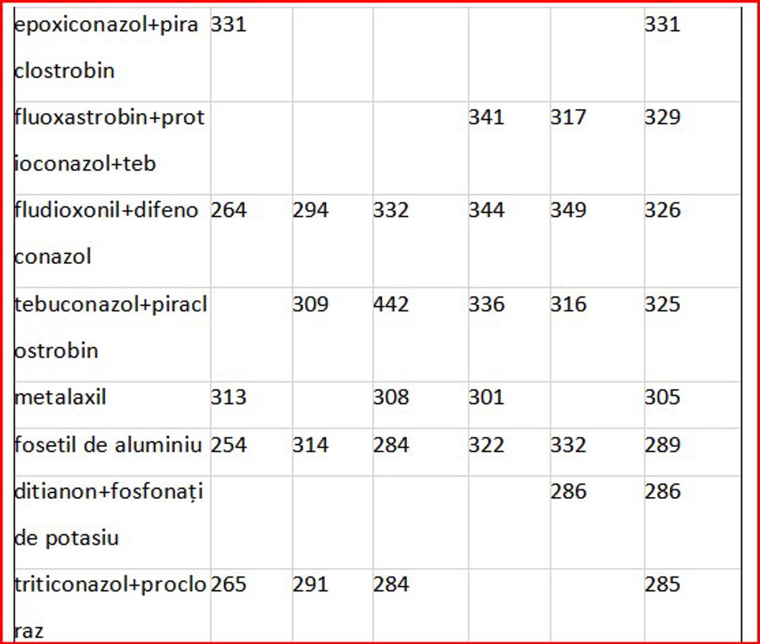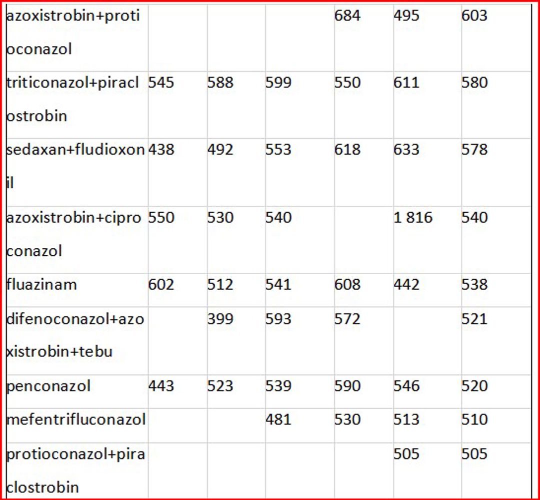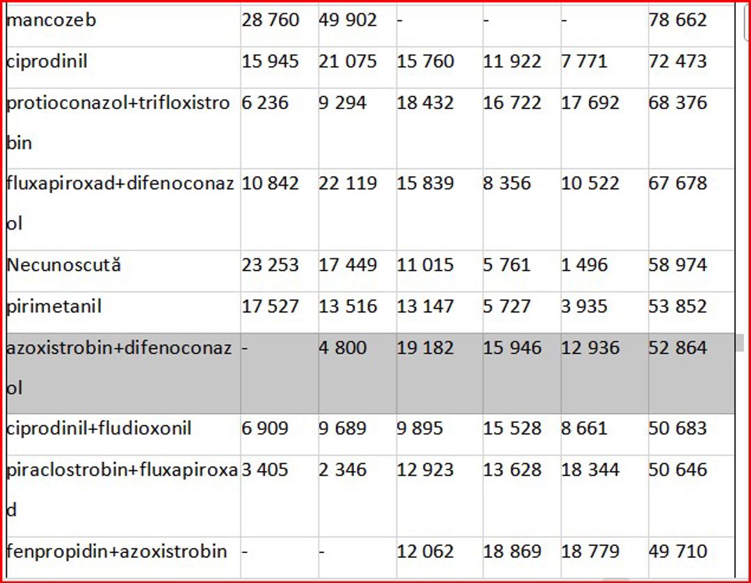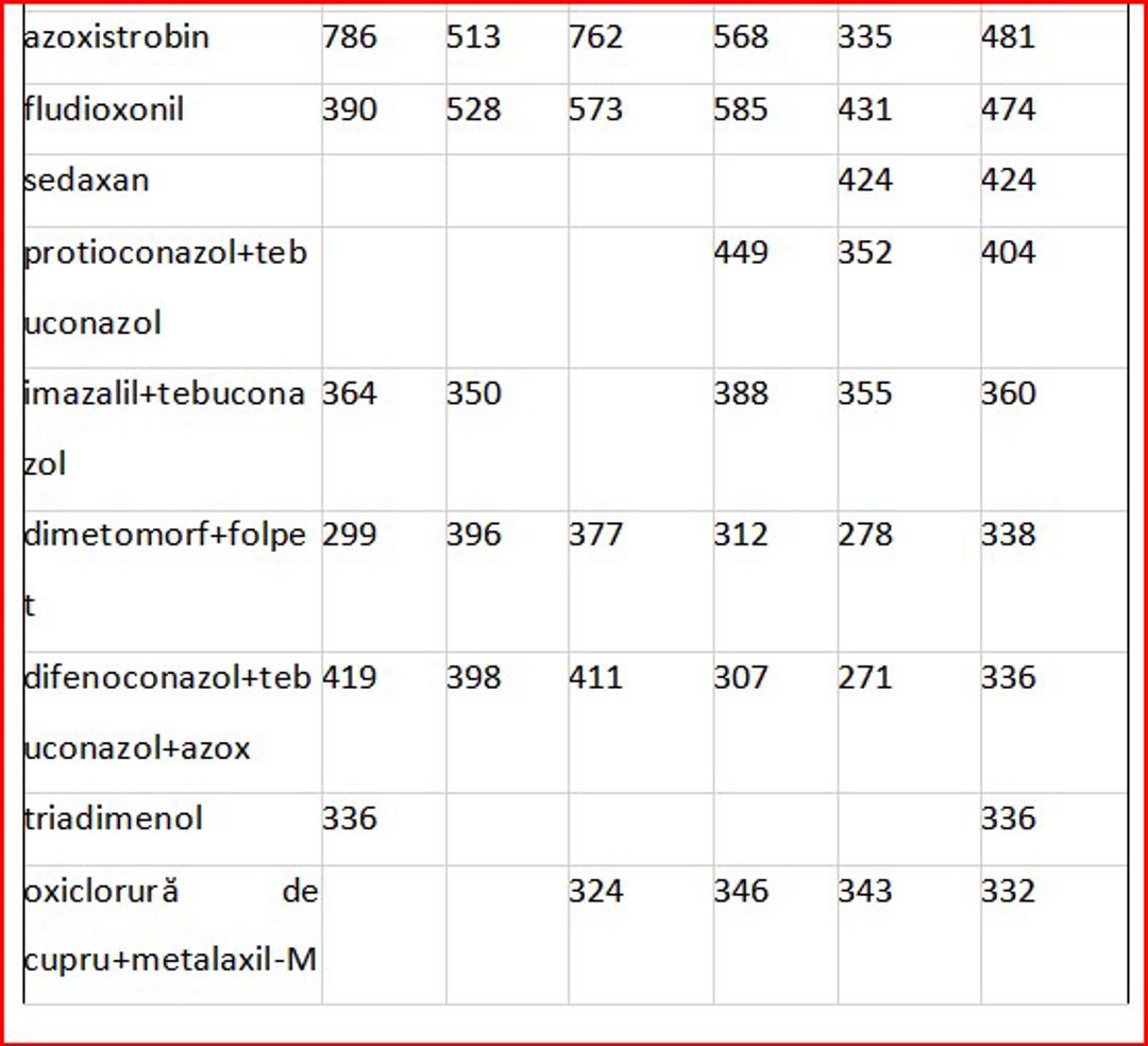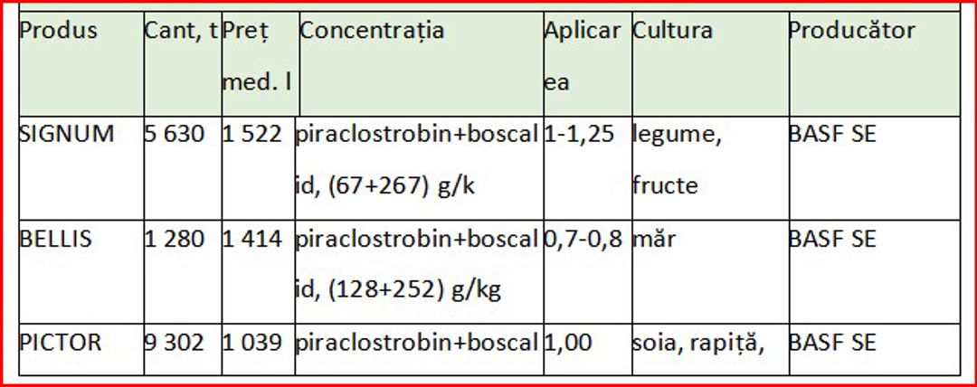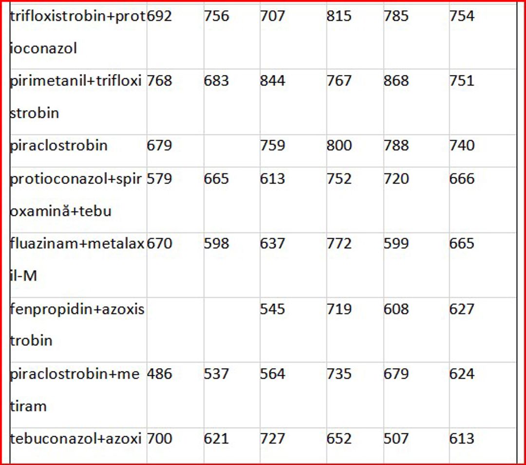 Substanțele active cum sunt- azoxystrobin, difenoconazol, depiraclostrobin+boscalid sunt utilizate în mod mai frecvent pentru legume, fructe și vița de vie, cu toate că includ și produse destinate cerealelor și oleaginoaselor. De exemplu, ASTARTA ONE 250 SC, pe bază de azoxistrobin, 250 g/l, produs de Fader Alliance Polska Sp.z.o.o, este utilizat pentru protecția grâului și a florii-soarelui, cu o rată de aplicare de 0,5-1 l/ha, având un preț mediu de import de 342 lei/kg-l.