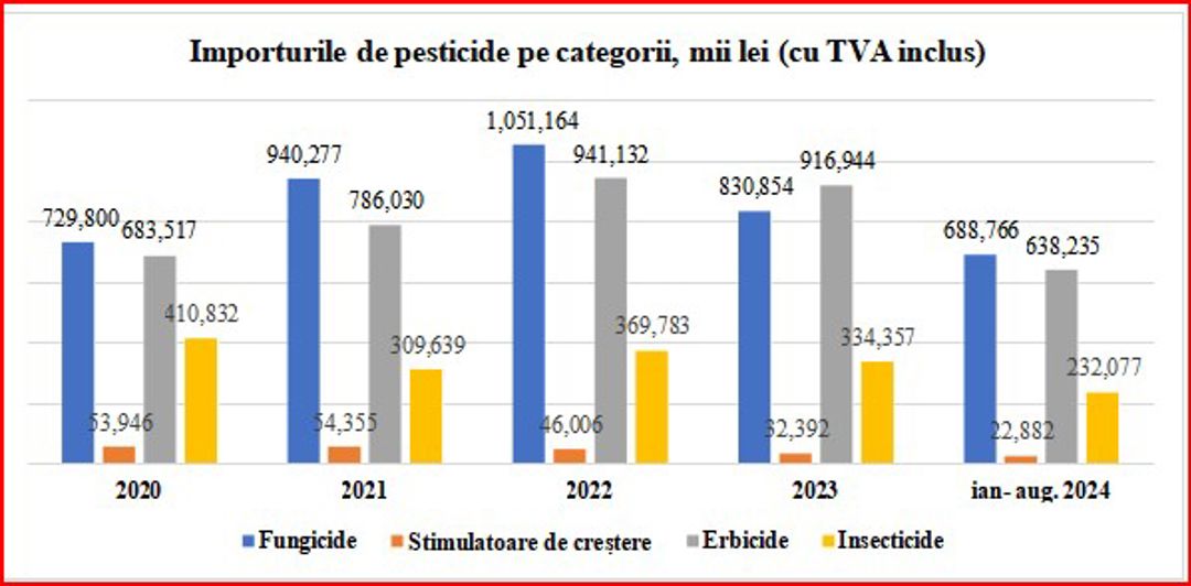 Din toate categoriile de pesticide importate, clasa fungicidelor valoric ocupă cea mai mare pondere, de circa 40-45 % în totalul importurilor. În ultimii trei ani, au fost importate produse în valoare de circa 800 milioane un miliard de lei anual. Per ansamblu anual sunt importate substanțe chimice pentru tratarea plantelor în valoare de 2-2,5 miliarde de lei.