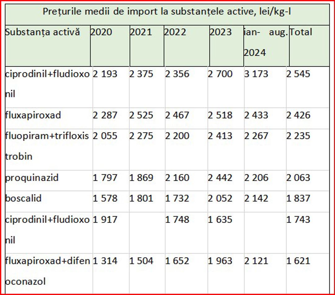 Analiza prețurilor de import ale fungicidelor relevă un asortiment vast de substanțe active, cu o gamă largă de prețuri, de la produse accesibile, cum este tebuconazolul, la substanțe premium precum fluxapiroxadul.