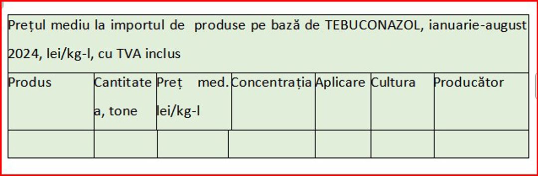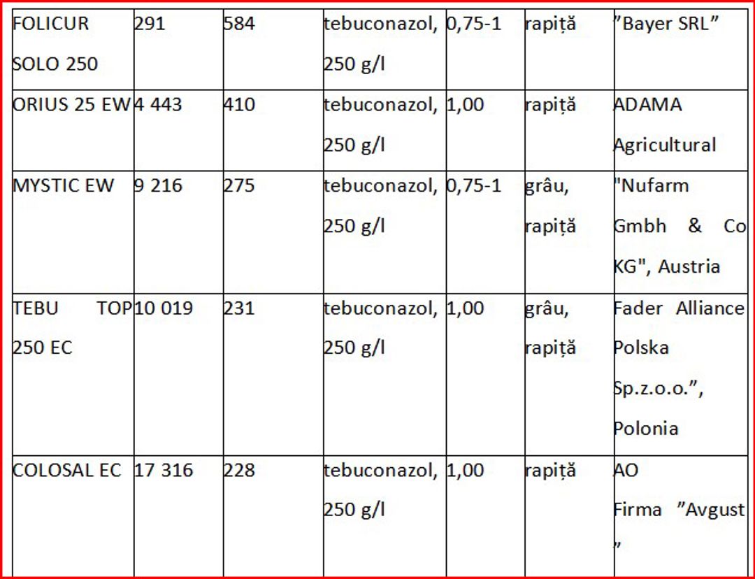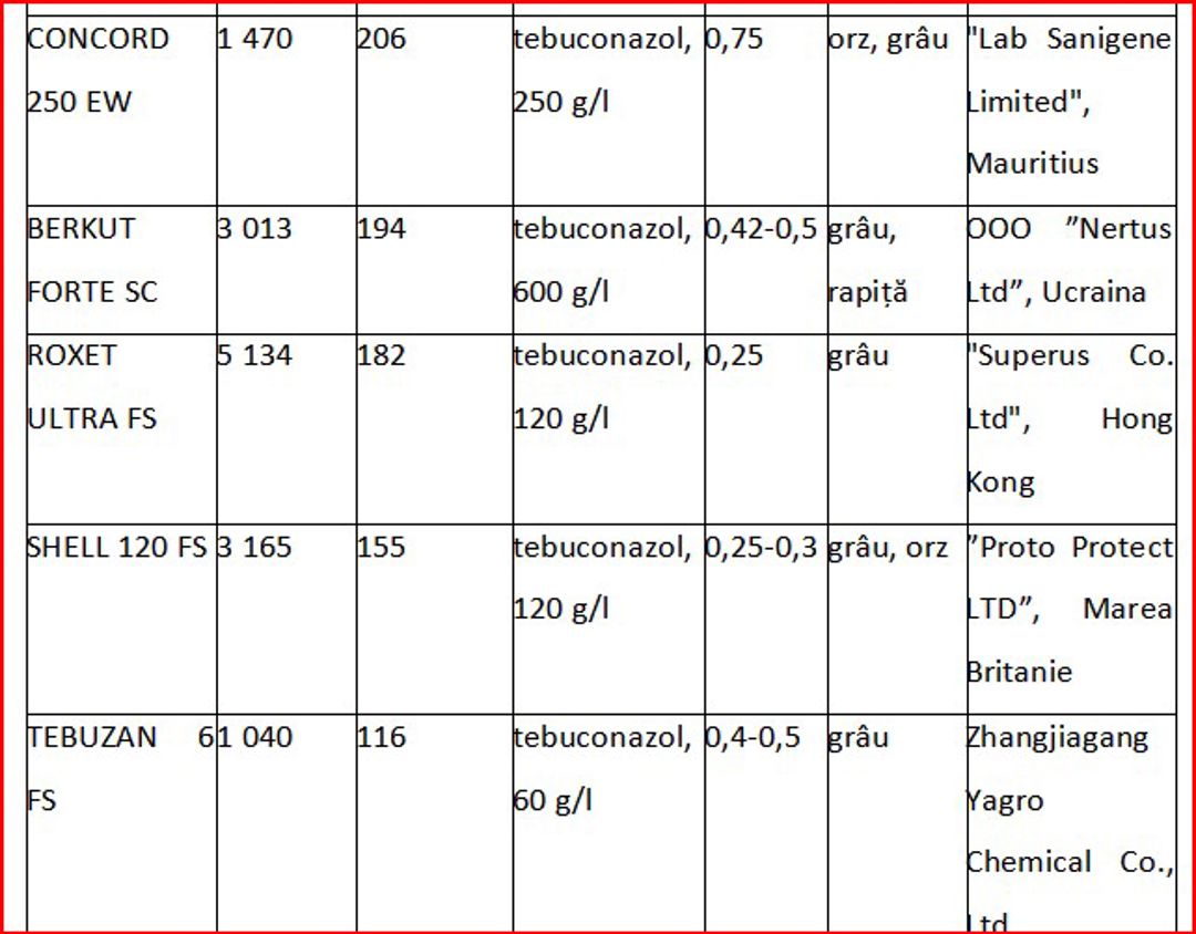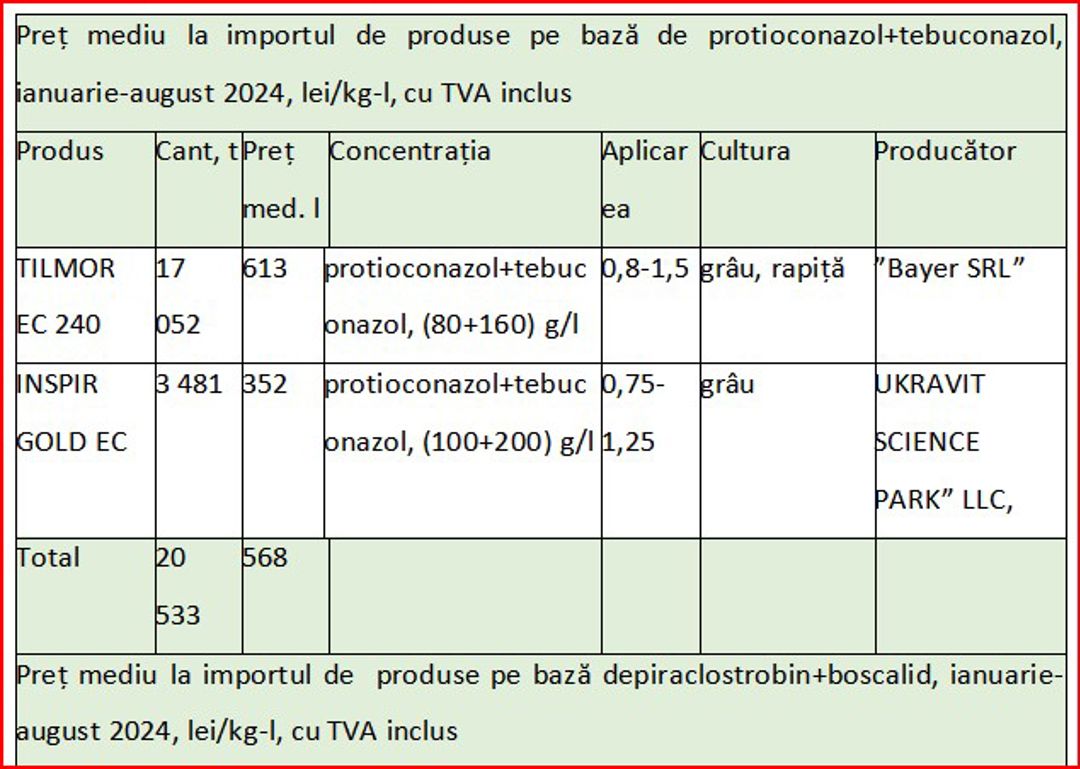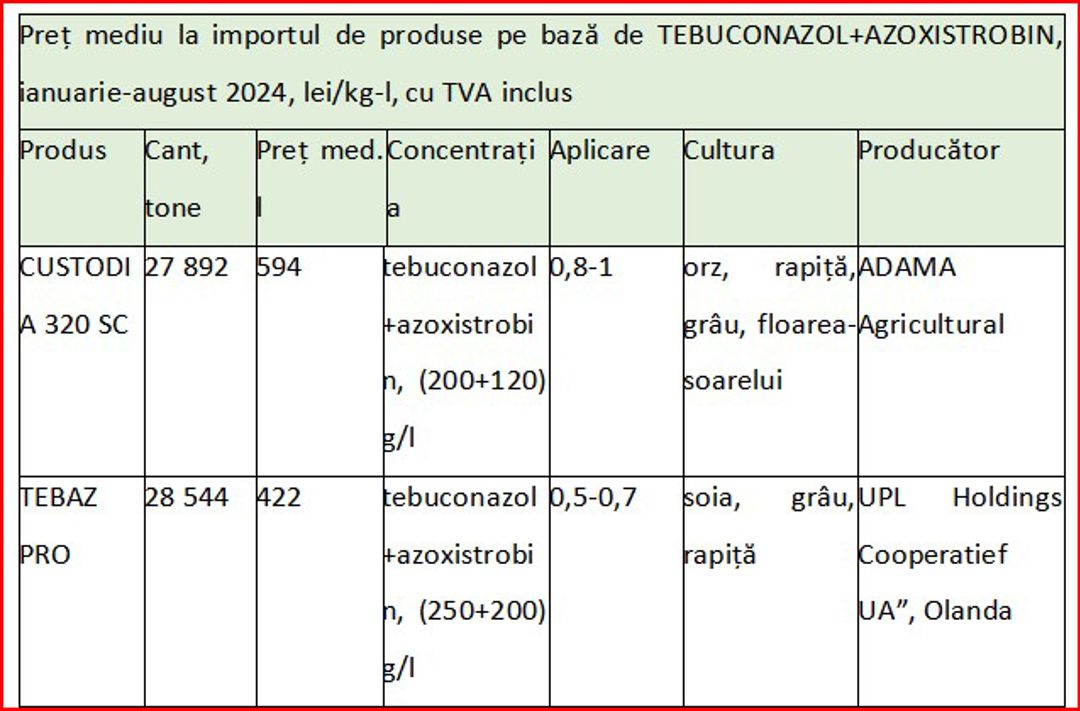 Totodată, Tebuconazolul este unul dintre cele mai utilizate fungicide în tratatementul cerealelor și oleaginoaselor a cunoscut o creștere continuă a importurilor până în 2023. În 2020, valoarea importurilor a fost de 10,5 milioane lei, dar aceasta a crescut în 2021, ajungând la 27,3 milioane lei, și ulterior la 34,4 milioane lei în 2023. În primele opt luni ale anului 2024, valoarea importurilor a scăzut până la 15,2 milioane lei, ce afost motivate de o scădere a prețului per unitate, datorită diversificării ofertei de produse generice, produse de companii precum firma AVGUST din Federația Rusă, care a venit cu alternative mai accesibile.