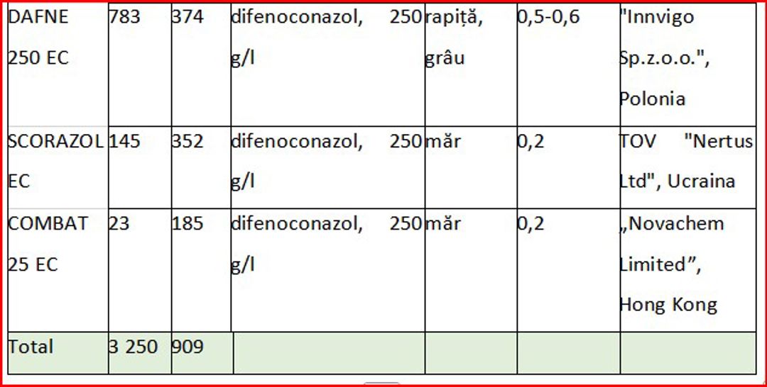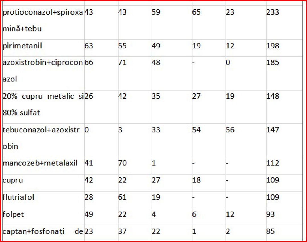 În ceea ce privește fungicidele specializate pentru cereale, datele reflectă o răspândire mai largă a produselor pe bază de tebuconazol. Astfel, în analiza importurilor din punct de vedere cantitaiv, pentru perioada ianuarie- august 2024, preparatele Tebaz Pro au constituit 29 tone al companiei UPL Holdings Cooperatief UA, Falcon Pro, 23 tone și Tilmor EC 240, 17 tone ale companiei Bayer SRL, 23 tone conduc clasamentul. Aceste fungicide sunt utilizate în combaterea bolilor precum septorioza sau rugina, la grâu și rapiță.