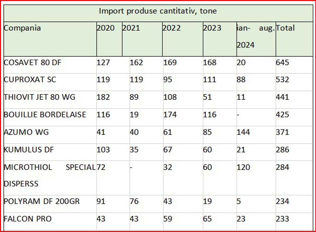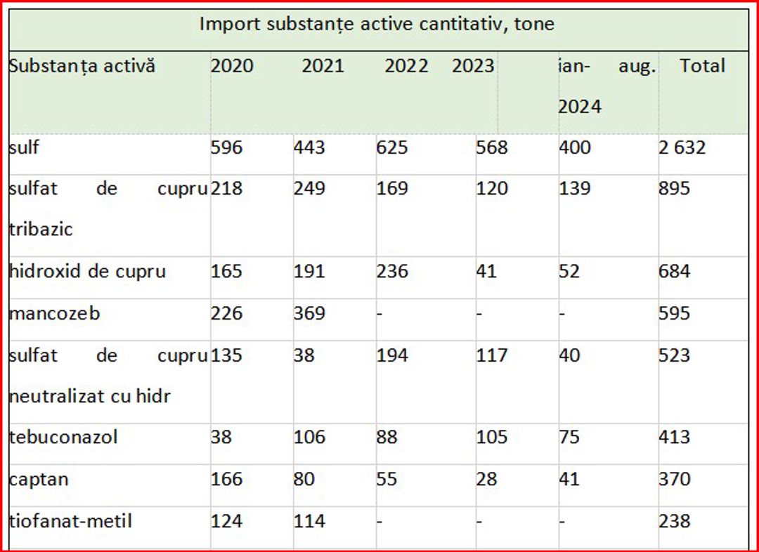 În primele opt luni ale anului 2024, volumul importurilor s-a ridicat la 2,07 mii tone, ce sugerează o stabilizare a cererii. În fruntea listei importului preparatelor grupate pe substanțe active se află sulful și compușii pe bază de cupru, cum ar fi sulfatul de cupru tribazic și hidroxidul de cupru. Acestea sunt utilizate în principal pentru protecția culturilor perene și legumicole împotriva bolilor, fiind apreciate pentru eficiența și costurile accesibile. Sulful pur domină piața, cu un total de 400 tone importate în perioada ianuarie- august 2024, urmat de sulfatul de cupru tribazic, 139 tone.