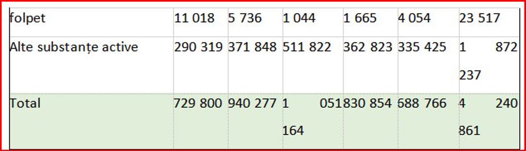 În rândurile fungicidelor pentru culturile de câmp, tebuconazolul este remarcat prin cele mai mari cantități importate, cu o tendință de creștere constantă în ultimii ani. În 2020, importurile au fost de 38 tone, însă acestea aproape că s-au triplat în 2021, ajungând la 106 tone. Ulterior, în 2022, cererea a scăzut ușor la 88 tone, dar și-a revenit în 2023, cu un total de 105 tone, menținându- se la un nivel ridicat. În primele opt luni ale anului 2024, au fost importate deja 75 tone.